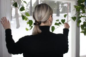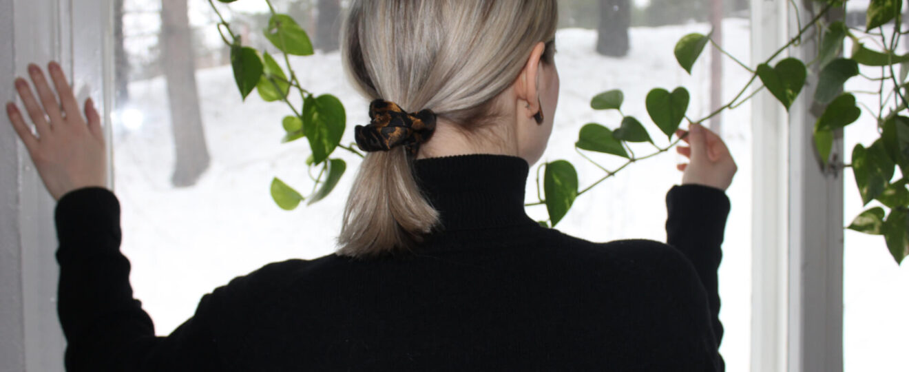 Jämäkankaista on helppo tehdä hiusdonitseja. Hiusdonitsiin riittää n. 10cm x 30 cm pala kangasta. Pakko sanoa, että pidän melkein enemmän tästä kankaasta hiusdonitsissa. Tämä donitsi sopiikin moneen asuun!
