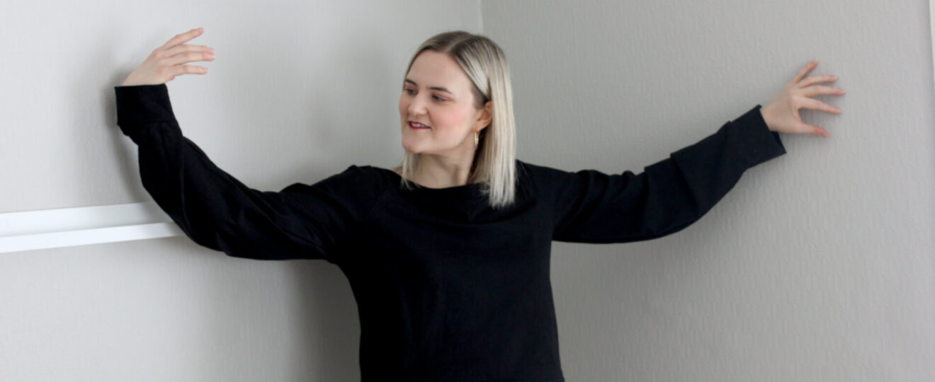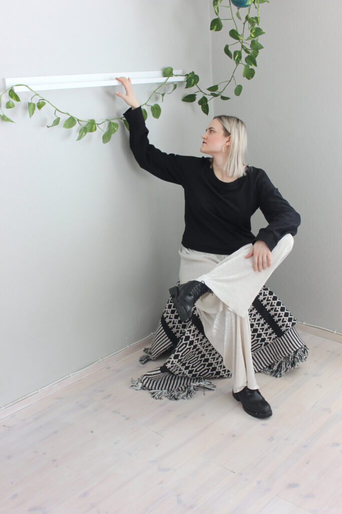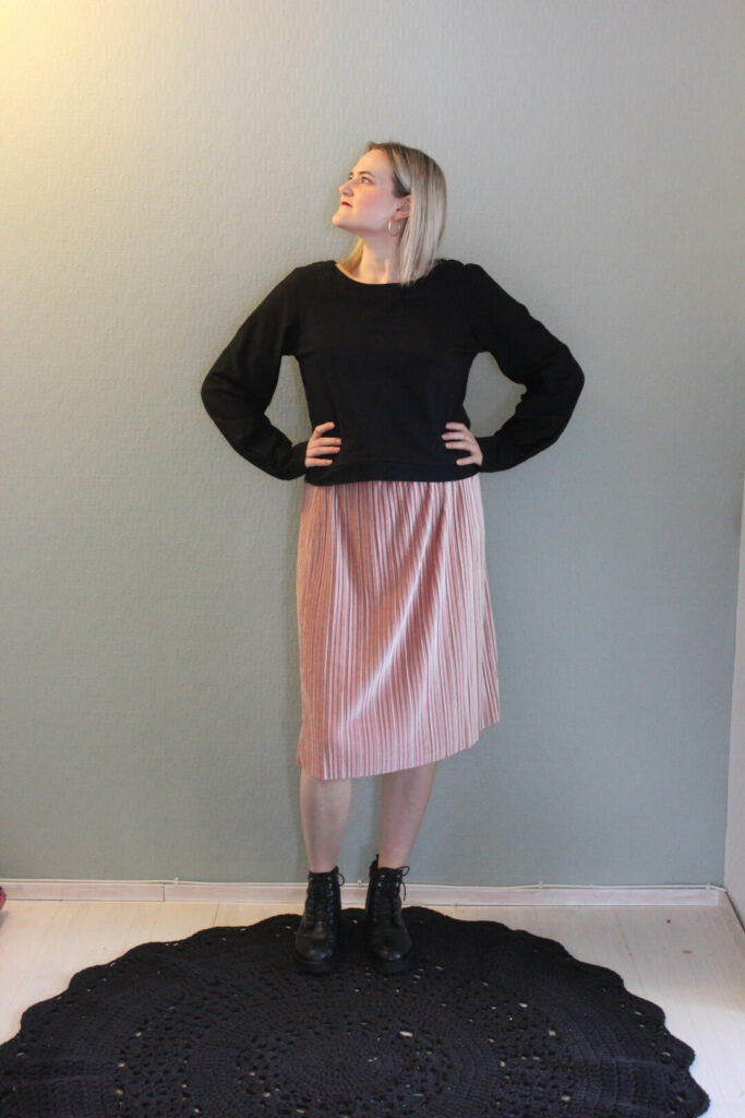 Olin pitkään miettinyt, että haluaisin ommella mustan collegen. Halusin kuitenkin collegeen jonkun pienen yksityiskohdan, jolla saisin siihen lisättyä hieman persoonallisuutta. Tähän collegeen päädyinkin tekemään pussihihat, jotka tuovat peruscollegeen täydellisen lisämausteen. Päädyin jättämään mallin aika lyhyeksi, jotta se sopii sekä korkeavyötäröisten housujen että hameiden kaveriksi. Lyhyempi ja laatikkomaisempi helma on helpompi yhdistää erilaisiin alaosiin kuin tiukempi pussimainen resori. Kaava-inspiraatiota sain tähän Suuri Käsityö -lehdestä, mutta sovelsin kaavaa omaan makuun sopivaksi. Kuvassa näkyvä musta pitsimatto on myös omaa käsialaa. Virkkausohjeita on tulossa myöhemmin blogiini eli stay tuned!
